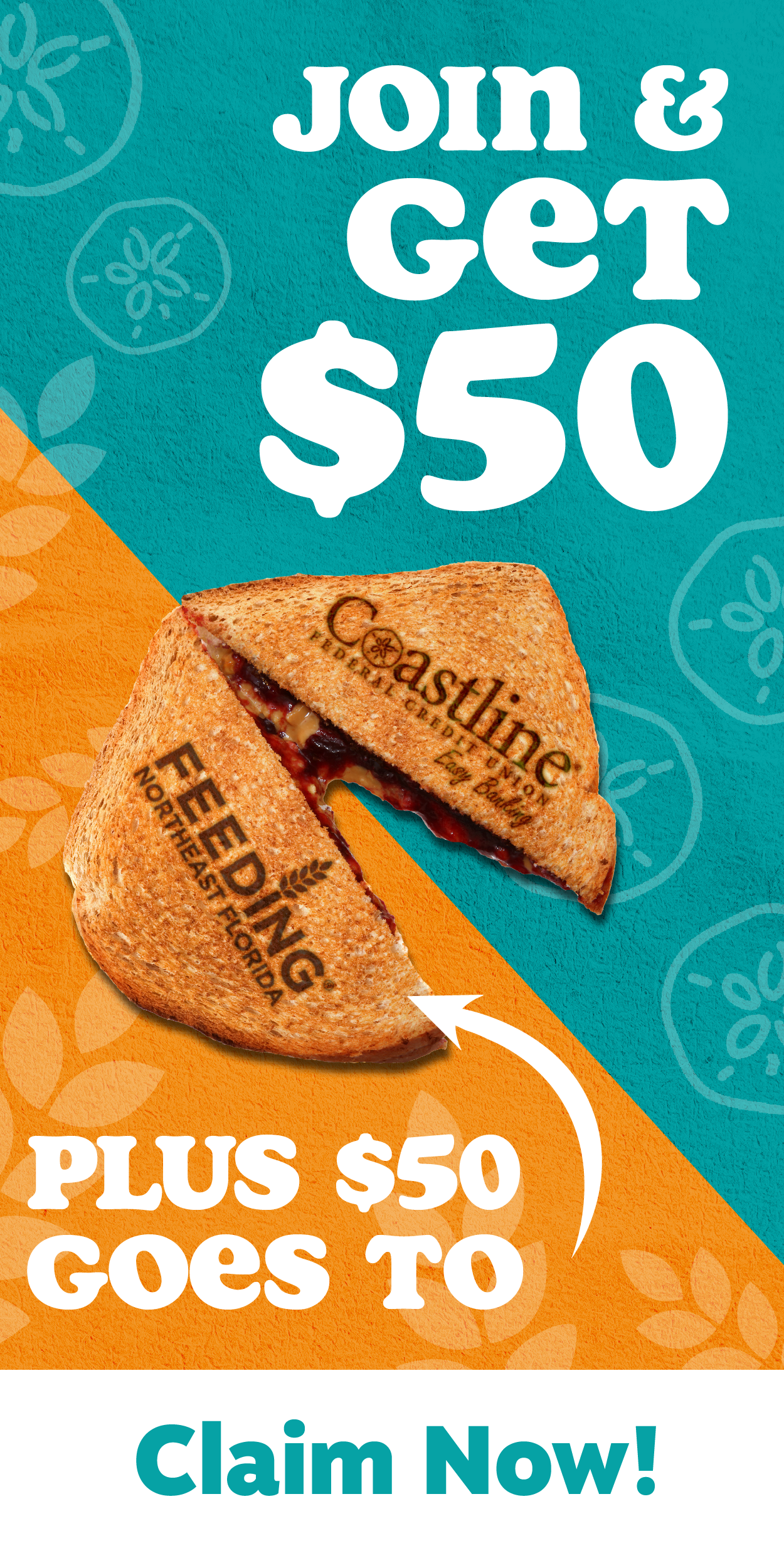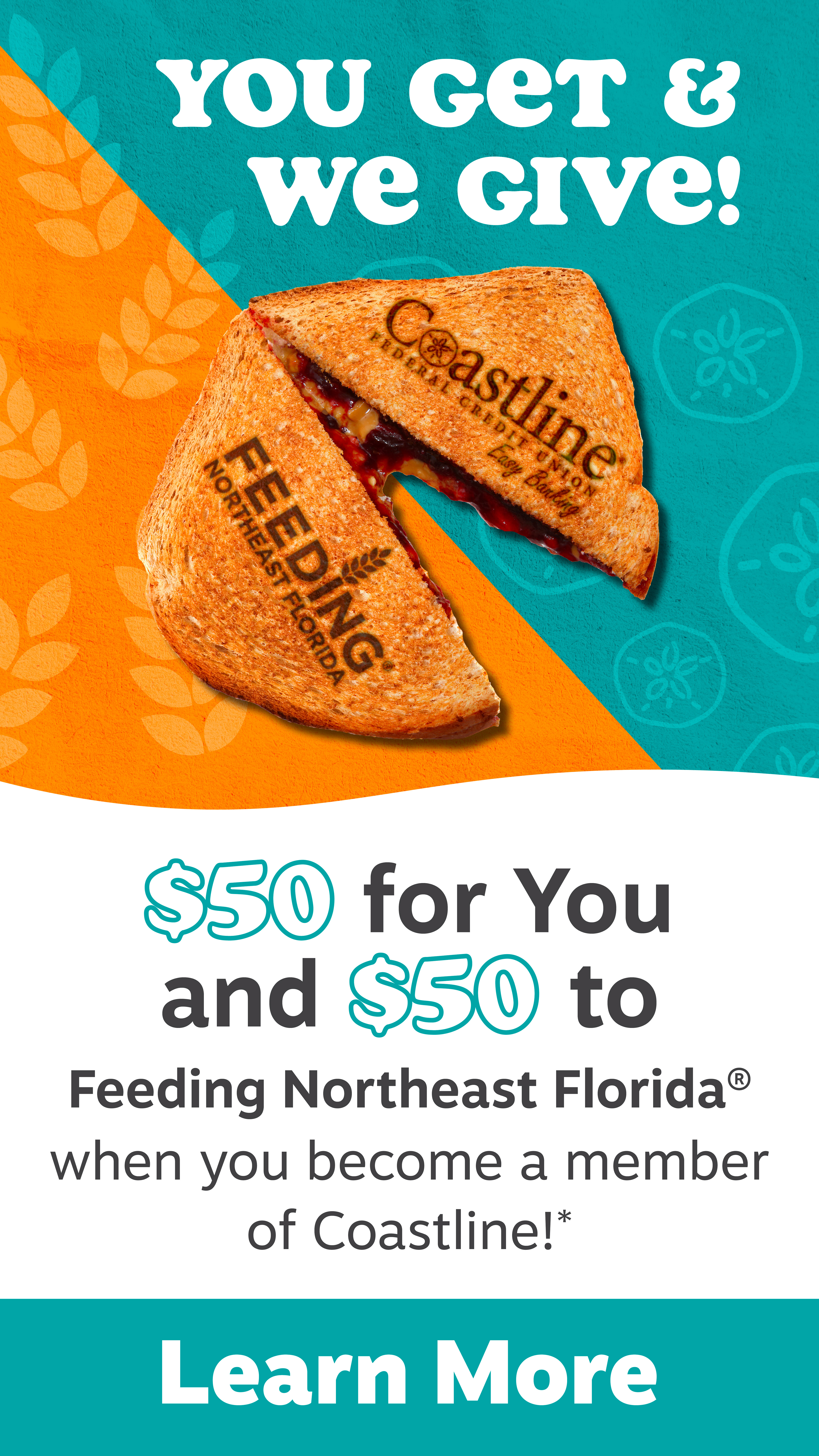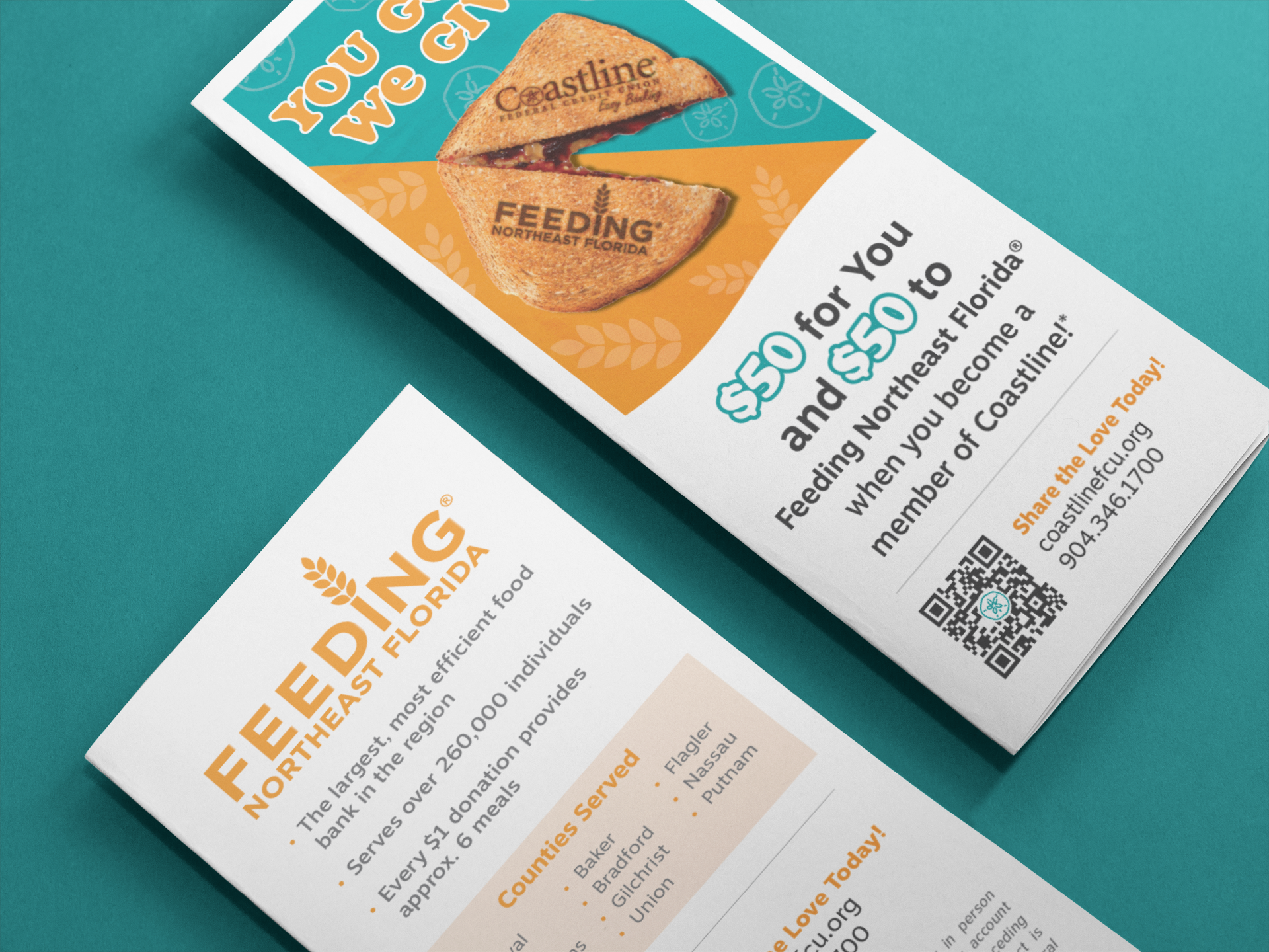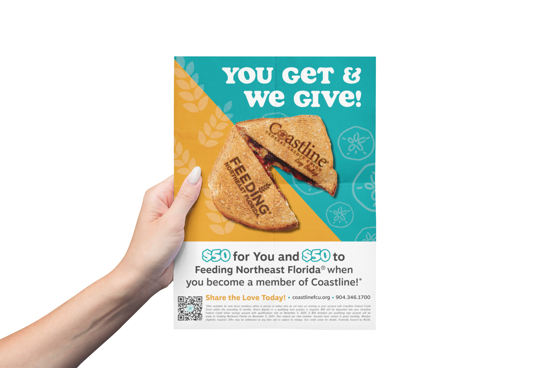 When a sandwich becomes a campaign… it's delicious! For Coastline Credit Union’s 50/50 campaign, I designed a fun way to share our great message. New members received $50, while another $50 was donated to Feeding Northeast Florida. To bring this to life, I designed a PB&J visual with both logos toasted into the bread—because nothing brings people together quite like a sandwich. Backed by Google Ads and an informational handout, the campaign turned a simple concept into a feel-good way to join, give, and make an impact.
