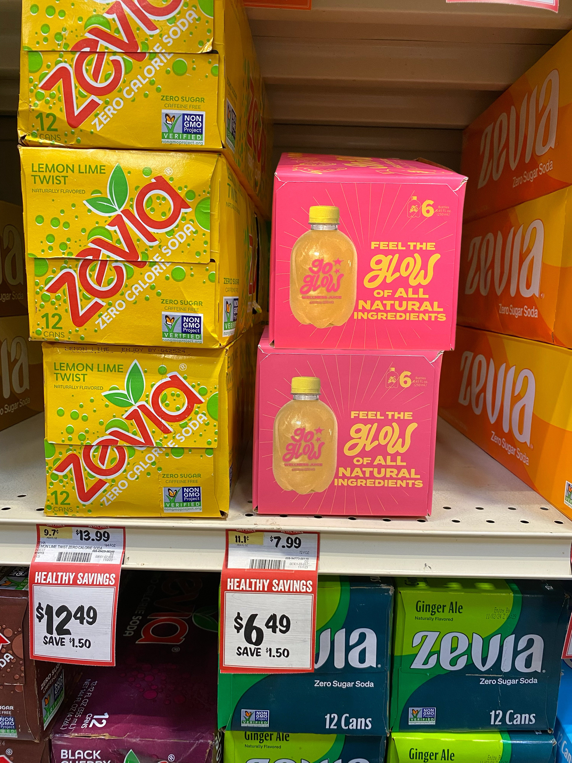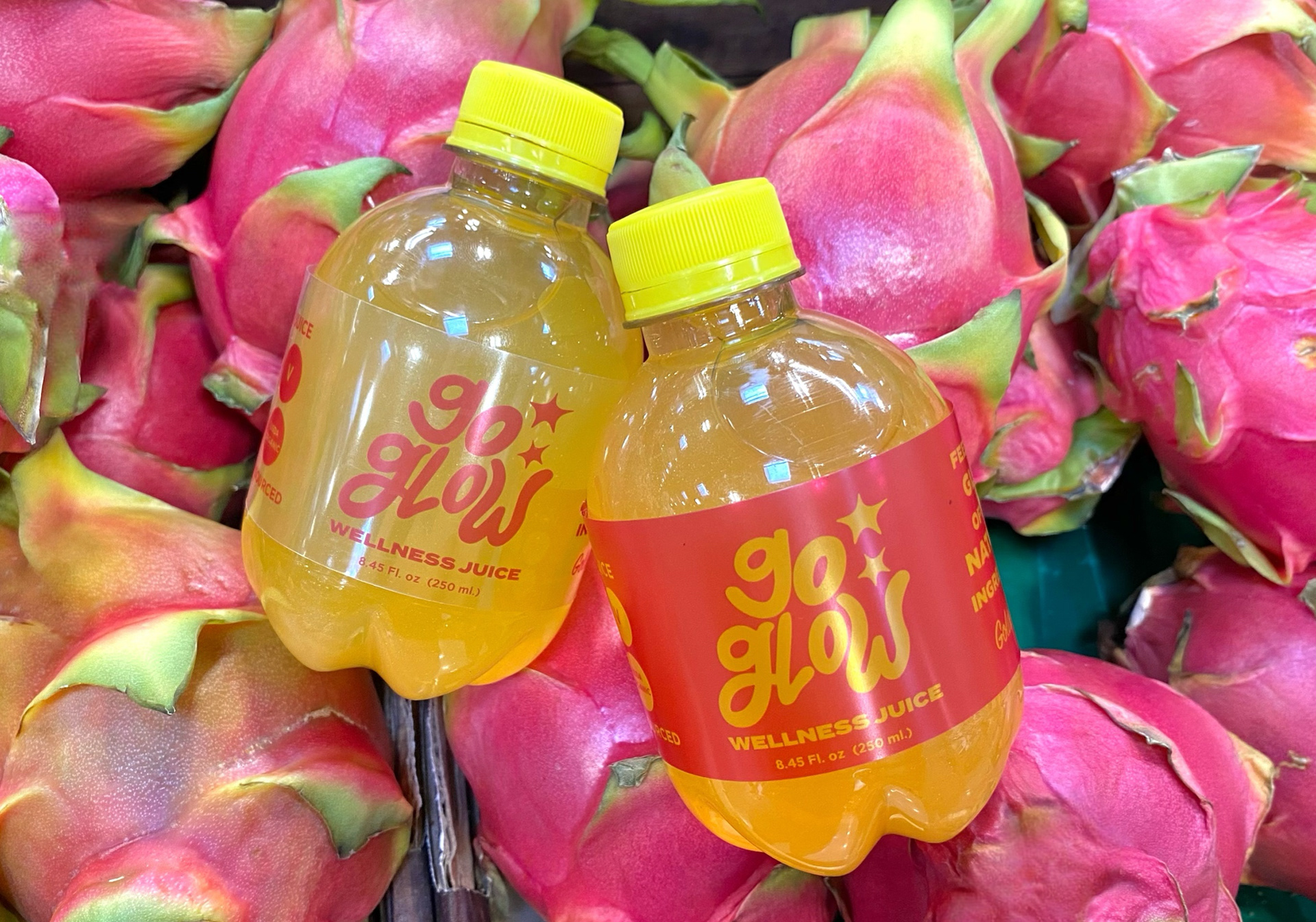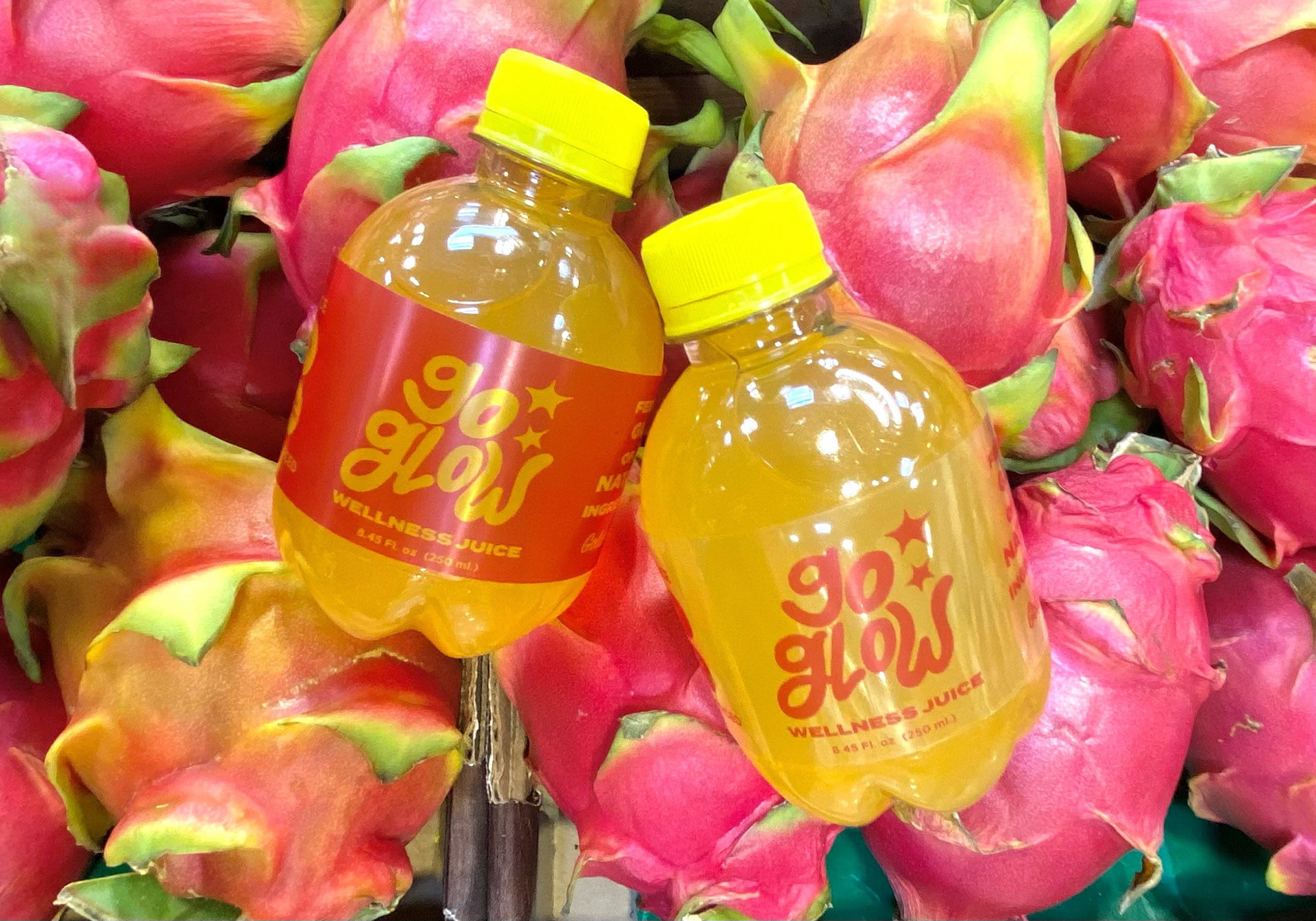 The hot pink and golden yellow provide just the POP of color that the wellness juice aisle has been missing. Gone are the days of outdated fruit juice you drink to cure a cold—Go Glow wants to make wellness an enjoyable part of your day, starting with an empowering name... Go Glow.
